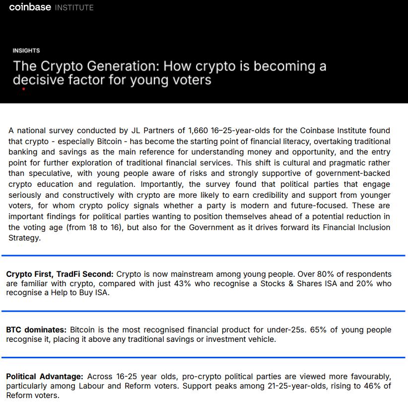 Research by Coinbase Institute and JL Partners, shared with Cointelegraph, found that crypto, led by Bitcoin (BTC), has overtaken traditional banking products as many young people’s entry point to understanding money, risk and financial opportunity. Just 43% recognize a Stocks & Shares Individual Savings Account and 20% a Help to Buy ISA, reflecting what the report describes as a “crypto first, TradFi second” re-ordering of financial literacy.